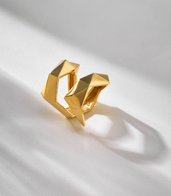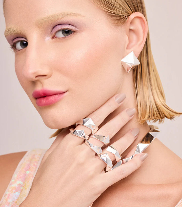 El anillo Prisma captura la esencia de las líneas diagonales que transmiten movimiento y energía. Una pieza que parece moverse alrededor de las manos y cuyas facetas reflejan la identidad de la colección: tecnología y modernidad. Su acabado en metal noble y altamente pulido adquiere mayor brillo con un baño de plata y oro.